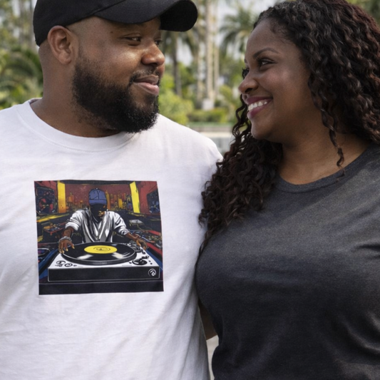 Get down with the Turntable Titan tee! Iconic DJ gear showcased in fresh detail. Urban vibes, bold colors, raw energy. Live for the beat!"