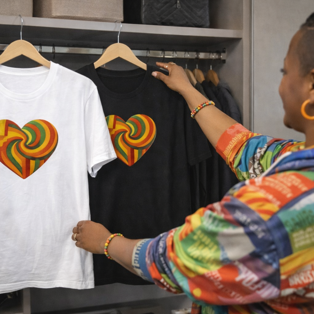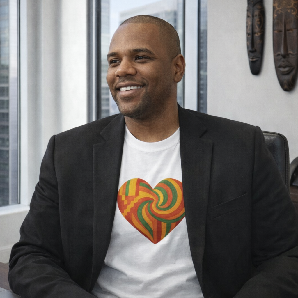 This shirt features a bold heart design filled with a flowing Kente-inspired pattern in vibrant gold, green, and red hues, symbolizing African heritage and cultural pride. Kente cloth, originating from Ghana, is traditionally associated with royalty, celebration, and unity, making it a powerful emblem of identity and resilience. The heart shape emphasizes the theme of love, and in this context, it highlights Black love—a celebration of strength, beauty, and connection within the African diaspora. The dynamic, three-dimensional look adds depth and energy, turning the design into a striking statement of cultural pride and affection.